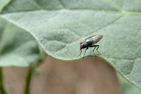 Macro of house fly on leaf.