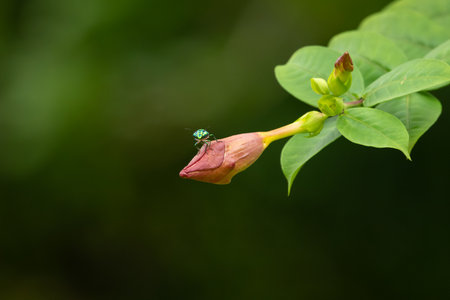 Beautiful macro of a green fly on a pink leaf in Madagascar