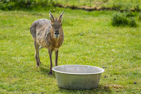 A little brown Mara animal drinking water from a basin on the grass
