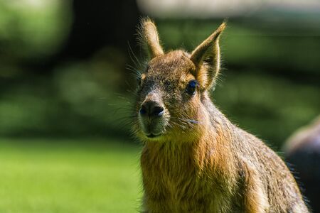 Beautiful baby Patagonian Mara close up portrait. Grass and leaves on the ground