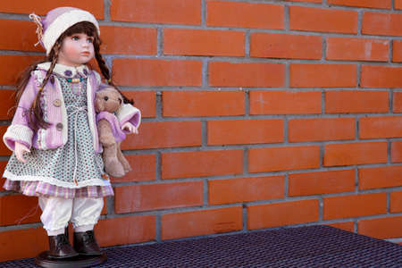 Background of a brick wall with doll stand. Big Doll