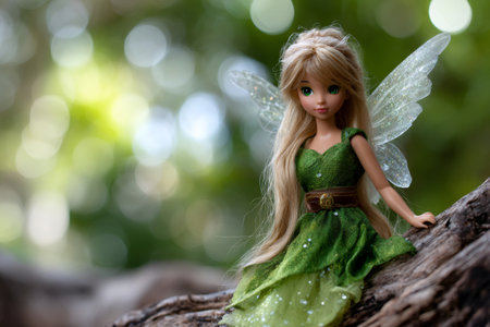 Blonde fairy doll with green dress and glitter wings sitting on a tree branch in a forest