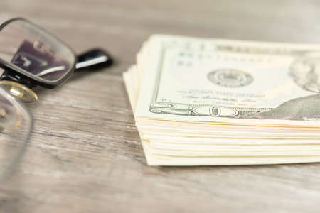 Stack of hundred-dollar bills on wooden surface of desk. Space for text. Concept of welfare and investment. Stop motion shooting