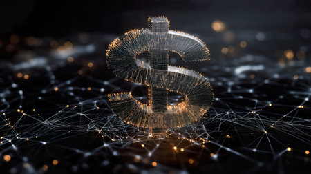 This intricate 3D rendering showcases metallic dollar signs set against a digital grid, emphasizing connections in finance and technology. The glowing elements represent the modern economy.