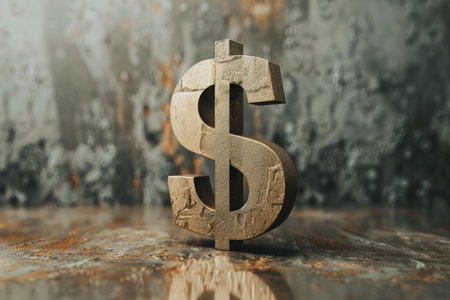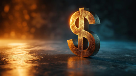 Detailed golden dollar sign on textured dark surface, illuminated by warm light, evokes sense of wealth and prosperity. intricate design adds elegance to financial symbol