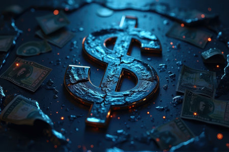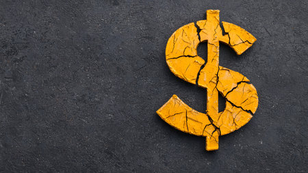 An orange, cracked dollar symbol lies on a dark, textured background. The atmosphere reflects financial stress and instability, evoking emotions of concern and reflection.