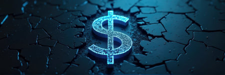 That the image is generated using AI. Illuminated dollar sign on cracked surface in blue light.