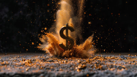 Golden dollar symbol emerges from cloud of shimmering particles, creating striking visual effect. scene conveys sense of wealth and prosperity, enhanced by dynamic explosion of dust and glittering