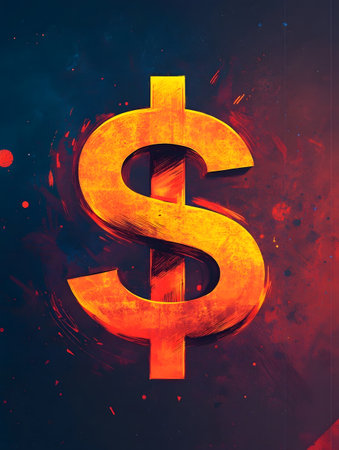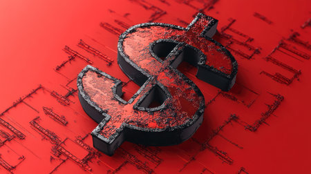 A striking illustration of dollar sign, symbolizing economic decline, set against vibrant red background. texture adds depth and emotion to image..