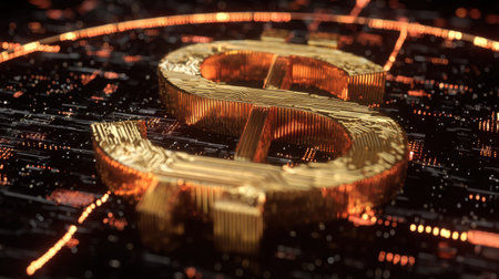 A striking golden dollar symbol emerges from a network of glowing circuits, representing the intersection of finance and technology in a modern digital landscape.