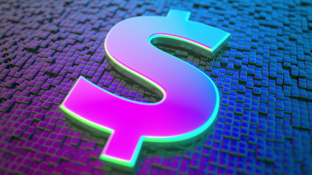 A detailed 3D rendering of an illuminated dollar sign against a dark digital background, representing financial success and modern economy themes.