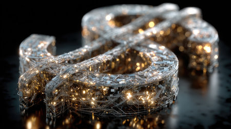 This captivating image features a detailed digital representation of a dollar symbol, illuminated with intricate light patterns, showcasing modern artistic design.