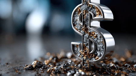 A striking dollar sign made of shiny metal rests on a surface covered with metallic shavings, capturing the essence of wealth and financial success in a modern world.