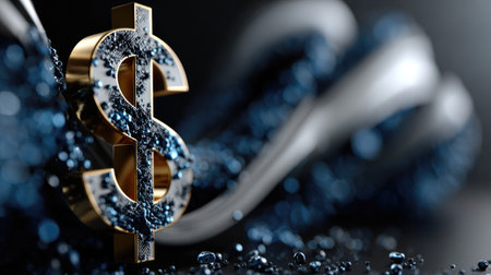 A striking image featuring a gold dollar sign set against a background of dark, sparkling textures. This visual represents concepts of wealth, finance, and luxury, perfect for creative projects focused on monetary themes.
