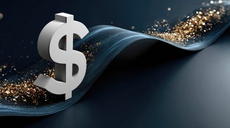 A modern silver dollar symbol stands prominently on a dark background, surrounded by a shimmering wave of golden sparkles, highlighting themes of finance and wealth.