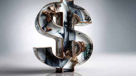 A striking metallic dollar sign stands on a rustic surface, reflecting light and creating a unique artistic representation of wealth and finance.