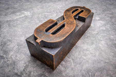 dollar symbol in vintage letterpress wood type block against textured handmade paper, macro shot