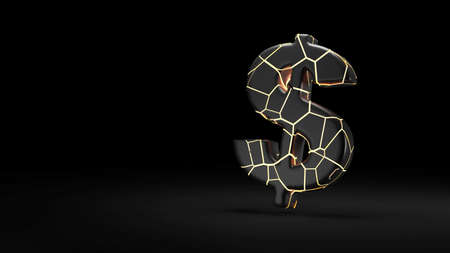 Broken dollar symbol on black background. 3d render illustration.