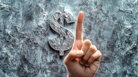 A hand confidently presents a provocative gesture, emphasizing the significance of money with a metallic dollar sign against a textured gray background.