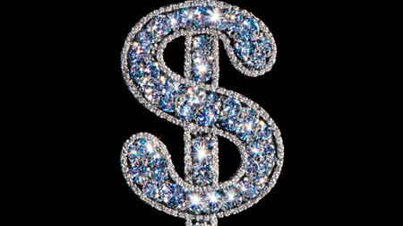 A close-up showcases a diamond-encrusted dollar sign, the main subject, against a stark black backdrop. The symbol is illuminated, revealing the facets of the gemstones. This high-contrast composition, with a focus on luxury, is suitable for financial, wealth-related, and design projects.