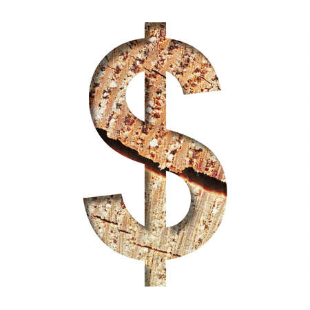 Wood cut font. Dollar money business symbol cut out of paper on the background of a cut of a tree with cracks and shavings. Set of decorative natural fonts.
