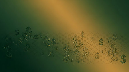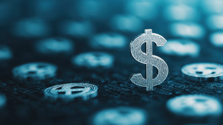 This intricate 3D rendering showcases metallic dollar signs set against a digital grid, emphasizing connections in finance and technology. The glowing elements represent the modern economy.