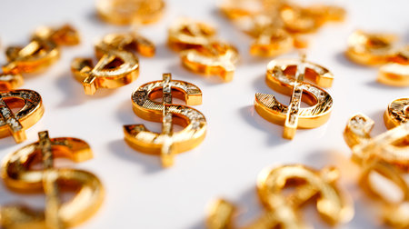 Sparkling gold jewelry shaped like a dollar symbol with glimmering rhinestones, delicately scattered on a pristine white background, exuding luxury an