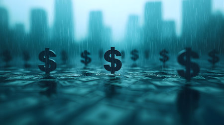 The image captures dollar signs pouring down through misty air, with a blurred city skyline backdrop. The atmosphere suggests financial distress, evoking feelings of uncertainty and concern.