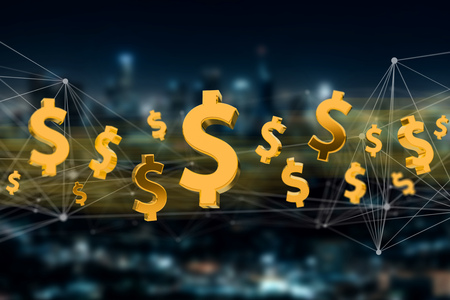 View of gold dollar symbol displayed on a city background - 3D rendering