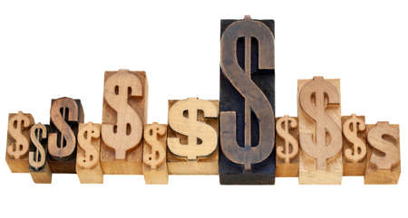 financial concept - a row of dollar signs - isolated vintage wood letterpress printing blocks