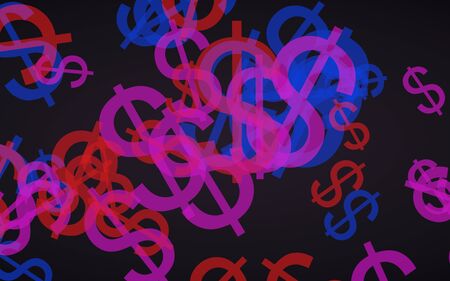 Multicolored translucent dollar signs on dark background. Red tones. 3D illustration