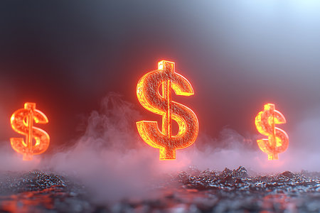 Three glowing dollar signs emerge from fog and metallic textures, representing financial themes and concepts in a modern, artistic manner.