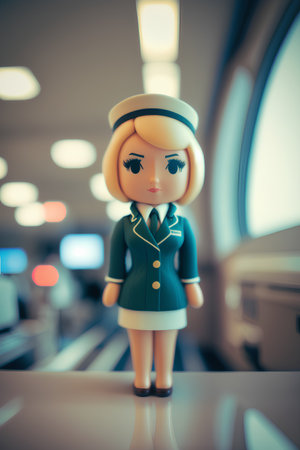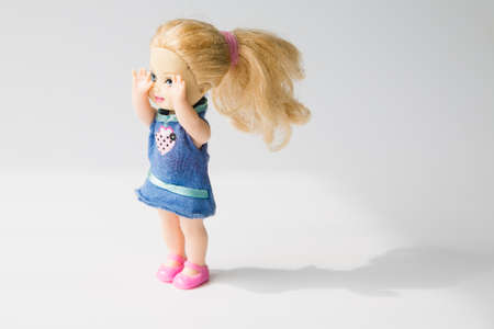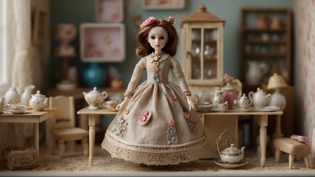 A cute toy doll with short hair and a shiny pink dress is positioned playfully in front of a soft white archway. This cheerful scene invites imagination and fun.