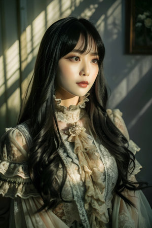 Portraits of posed models, She wears Romantic style features soft, feminine, and delicate pieces