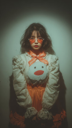 A person poses in a playful clown outfit with a soft toy on their chest showcasing vibrant colors and bold accessories in a moody setting.