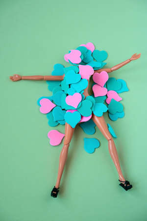 plastic doll lies under a pile of blue and pink hearts, popularity in social media concept, top view