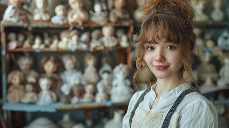 Portrait of woman making soft toys in her studio, lots of toys are sitting on shelves, business and hobby concept