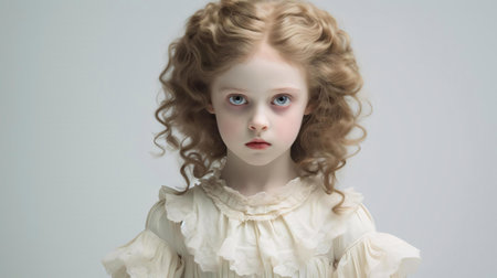 A striking portrait of a vintage bisque doll, illuminated to create a dramatic and mysterious atmosphere. the doll's green eyes and porcelain complexion stand out against the deep shadows, evoking a sense of intrigue and nostalgia. AI generation