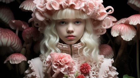 A young girl with white hair wearing a pink hat and holding flowers. Generative AI image.