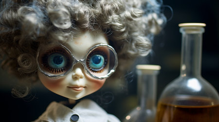 a doll with glasses, exuding a scientific academia vibe, is captured against a smokey background using a nikon pc-e micro nikkor 85mm f/2.8d lens. the doll's shiny eyes and baroque grandiosity add an eye-catching detail to the image, while maintaining scientific accuracy. ai generated