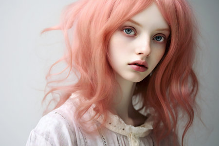 A whimsical doll with striking makeup and pink curls posed against an ornate background in a playful setting.