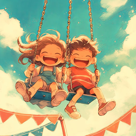 Two children experience joy while swinging together outdoors under a sunny blue sky, conveying happiness and summer fun.