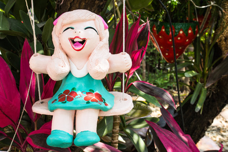 Plaster dolls of happiness children sitting on swing.