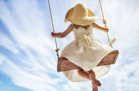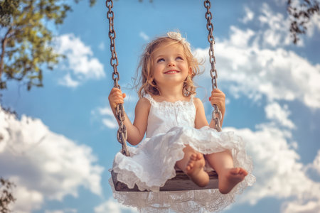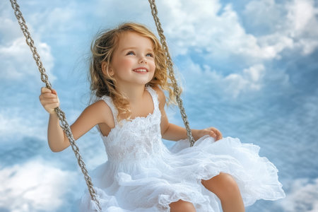 A young girl swings happily, wearing a white dress, surrounded by a beautiful sky of soft clouds.