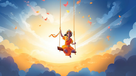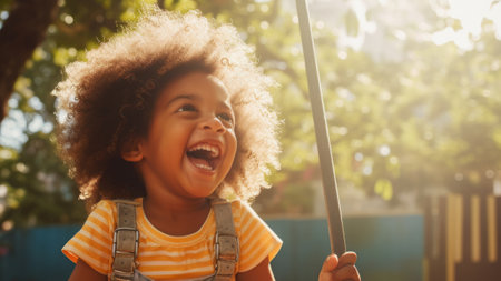 Joyful African American kid boy laughing on a swing on a warm sunny day on a playground. Concept of carefree play, happy childhood, summer fun, and outdoor activities. Digital illustration