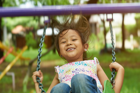Asian girl swinging and smiling. Filipina kid