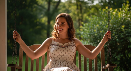 A woman with curly hair sitting on a swing, AI