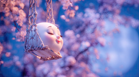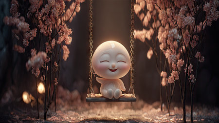 3d render of a cute doll sitting on a swing surrounded by flowers