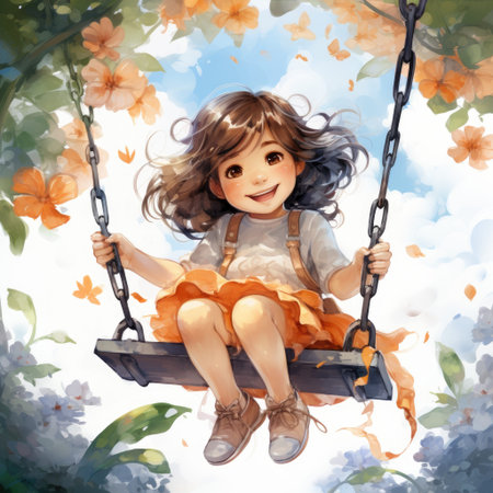 Cute little girl sitting on a swing in a blooming spring garden. Watercolor cartoon illustration