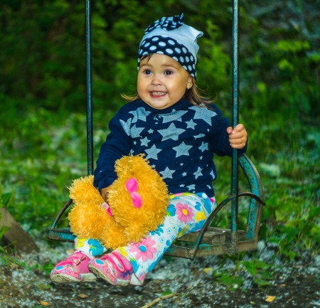 Happy laughing baby girl in a swing on a playground
